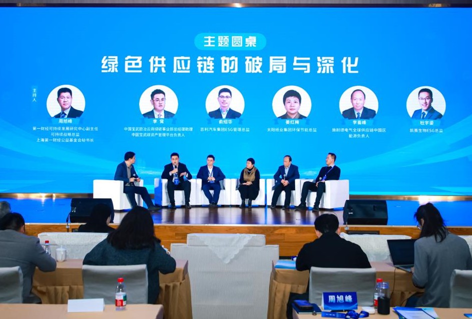 圆桌一以“绿色供应链的破局与深化”为主题,第一财经、吉利汽车集团、中国宝武欧冶云商、太阳纸业集团、施耐德电气、凯赛生物等先锋企业代表分享了绿色供应链构建中的多方协同路径与治理创新经验,为行业构建了可复用的实践参考模型。