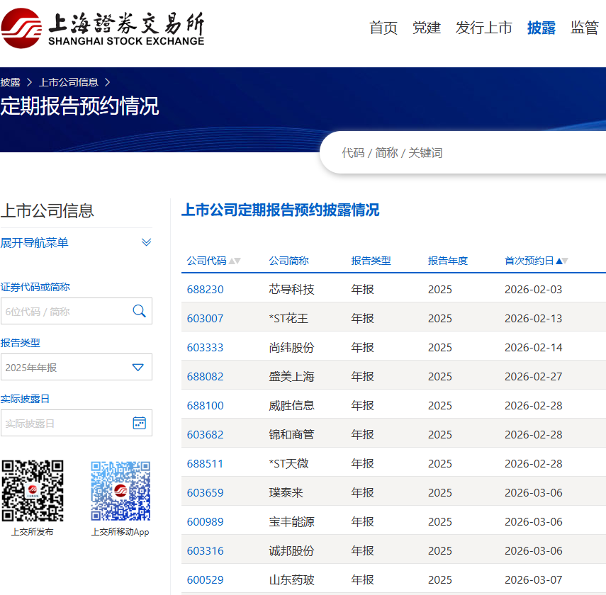 沪市公司2025年报预约披露时间出炉,芯导科技将于2026年2月3日率先披露年报,*ST花王、尚纬股份紧随其后,分别在2026年2月13日、2026年2月14日披露。