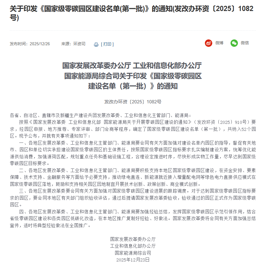 12月26日,国家发改委、工信部、国家能源局联合公布《关于印发《国家级零碳园区建设名单(第一批)》的通知》(下称《通知》)。