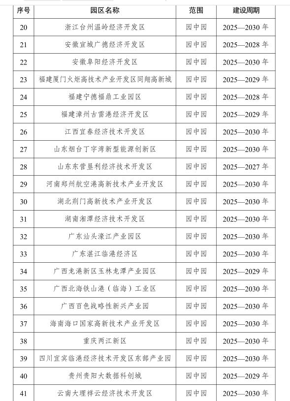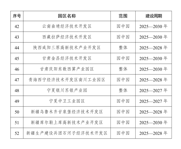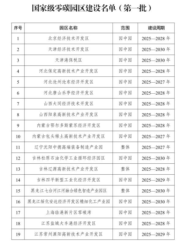 根据《通知》,按照《国家发展改革委 工业和信息化部 国家能源局关于开展零碳园区建设的通知》(发改环资〔2025〕910号)要求,经园区申报、地方推荐、专家评审、部门会商等程序,确定了国家级零碳园区建设名单(第一批),共纳入北京经济技术开发区、天津经济技术开发区、天津港保税区等52个园区。