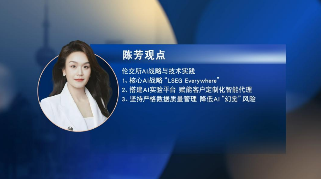 伦敦证券交易所集团(LSEG)中国及北亚区董事总经理陈芳围绕伦交所集团在AI领域的探索实践,分享了对金融创新赋能的思考。作为全球金融市场基础设施和数据服务的引领者,伦交所集团推出核心AI战略“LSEG Everywhere”,将庞大的数据体系与先进云和AI技术结合,打造可信赖的AI解决方案。