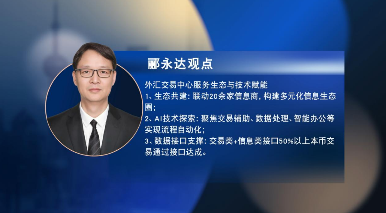 外汇交易中心目前能够提供哪些数据接口两支持金融机构数字化转型和数字化交易?郦永达表示,交易中心推出交易类与信息类两大类接口,覆盖交易全链路:交易前提供基础数据下载,交易中支持行情获取与自动化报价,交易后助力清算账务处理;信息类接口则为收益率试算、多因子分析模型构建提供支持,目前50%以上的本币交易通过这些接口达成。