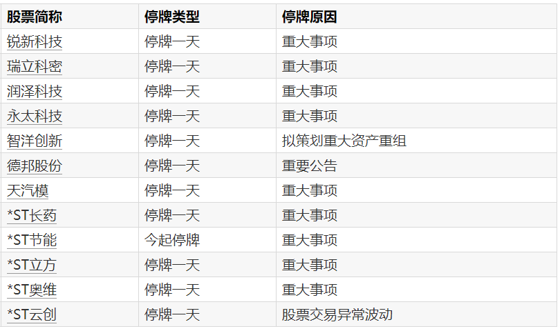 A股停牌提示:12股今日停牌
