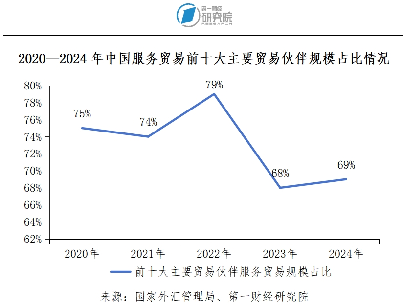 从历史数据来看,中国服务贸易伙伴的集中度在近年来有所变化,2022年服务贸易前十大伙伴的规模占比高达79%,而2024年这一比例则有所下降(占比为69%)。这在一定程度上反映了中国在服务贸易领域的市场多元化程度有所提升,服务贸易伙伴的结构更加均衡。我们认为,这一变化与中国近年来逐渐加强与“一带一路”共建国家和地区的服务贸易合作有关。具体而言,中国加强了与金砖国家、上海合作组织(简称“上合组织”)以及中东欧国家在服务贸易方面的合作,比如中国与金砖国家签署了《金砖国家服务贸易合作路线图》,与中东欧国家签署了《中国—中东欧国家服务贸易合作倡议》,与上合组织成员国签署《上海合作组织成员国服务贸易合作框架》。此外,中国还与俄罗斯、新加坡签署深化服务贸易合作谅解备忘录,与新加坡、阿根廷、乌拉圭、葡萄牙等国建立了服务贸易合作机制。在一些重点领域,中国电商平台如拼多多、阿里、TikTok和SHEIN等近年来在东南亚、中东、拉美等新兴市场迅速扩张,成为中国电商出海的重要力量,也带动了我国支付、物流、营销等配套服务的出口。比如,菜鸟网络在国际物流基础设施方面持续投入,为电商平台提供物流支持;TikTok通过直播带货、网红营销等方式带动产品的销售。同时,一些新兴市场国家对智慧城市、人工智能与大数据等需求日益增长,带动中国高附加值服务的出口。比如,阿里云、华为云等中国企业通过与沙特本地企业合作,积极参与沙特的云计算市场,为当地提供先进的数字基础设施和服务。在建筑服务行业,中国企业在“一带一路”共建国家的承包工程业务表现良好。根据商务部数据显示,2024年,中国企业在“一带一路”共建国家新签承包工程合同额为2324.8亿美元,占对外承包工程新签合同总额的87%;完成营业额1387.6亿美元,占对外承包工程完成营业总额的83.6%。