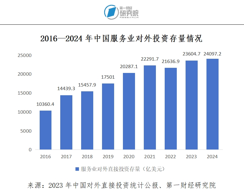 世界贸易组织(WTO)发布的《服务贸易总协定》(GATS)显示,服务贸易有四种提供方式:跨境交付、境外消费、自然人移动和商业存在。其中,商业存在是服务贸易的重要组成部分,其核心是服务提供者在东道国设立机构或分支机构,并通过这些实体向当地消费者提供服务。对此,我们可以将商业存在视为境外投资的一种形式,因为它需要在东道国设立实体,这需要一定的资金投入和长期的经营安排。商业存在模式在促进东道国经济发展、推动产业升级和技术创新等方面具有重要意义。与商业存在相关的主要是跨国投资,因此,我们从对外投资的角度来分析中国服务业企业对外投资的趋势。数据显示,中国对外直接投资存量近八成在服务业,并且服务业对外投资的规模和增速均呈现明显上升趋势。根据商务部的数据,中国服务业对外直接投资占总投资的比重保持在70%以上。从规模来看,2016—2024年,中国服务业对外直接投资存量从10360.4亿美元增长至24097.2亿美元。从行业来看,截至2024年底,中国对外直接投资存量规模中,租赁和商业服务业,信息传输、软件和信息技术服务业,批发零售业,金融业是投资的主要领域。此外,近年来,中国服务业企业实力不断增强,一批具有世界影响力的品牌开始“走出去”。比如,蚂蚁科技、抖音等头部服务企业已经开始在海外设立研发中心和营销中心,推动其品牌走向国际市场。