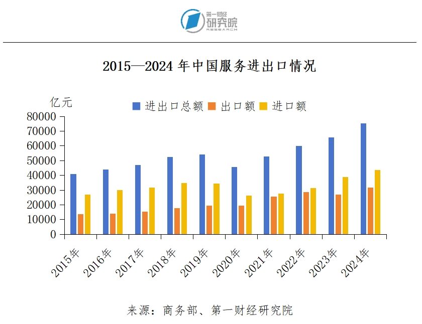 商务部发布的数据显示,中国服务贸易规模在过去十年中呈现持续扩大的态势,服务进出口总额从2015年的40745亿元持续增长至2024年的75238亿元,增长近1.8倍。2025年1—10月,中国服务贸易延续了这一增长趋势,服务进出口总额为65844.3亿元,同比增长7.5%,增速高于同期货物进出口总额的增长水平。此外,随着服务贸易规模的扩大,其内部结构也在不断优化。从进出口结构来看,2024年中国服务出口31755.6亿元,同比增长18.2%;进口43482.3亿元,同比增长11.8%,出口和进口均实现了显著增长,其中服务贸易逆差为11726.8亿元,比上年减少314.3亿元。同时,2025年1—5月,中国服务出口14033.7亿元,同比增长15.1%;进口18509.9亿元,同比增长2.7%,服务出口增速显著高于进口增速,服务贸易逆差较去年同期减少23.2%。从行业分类来看,近年来,知识密集型服务逐渐成为中国服务贸易增长的关键力量。2024年,中国知识密集型服务进出口总额为28965.2亿元(占服务贸易总额的38.5%),同比增长6.5%,贸易顺差4181.2亿元,较去年扩大504.5亿元。其中,知识密集型服务出口达16573.2亿元,同比增长7.4%,主要表现为个人文化和娱乐服务、电信计算机和信息服务出口的快速增长。