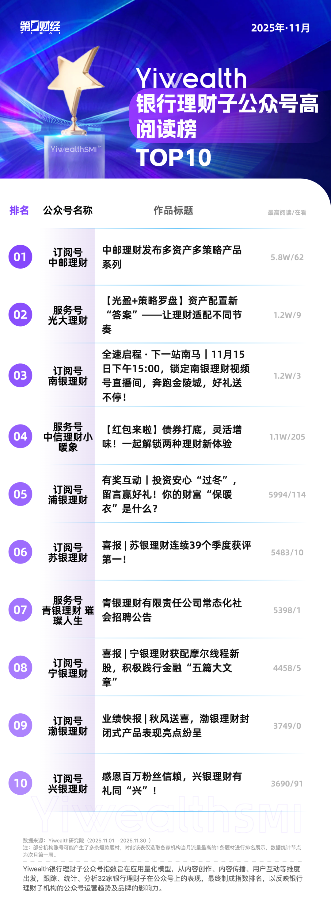 本期银行理财子公众号榜单TOP3分别为中信理财小暖象、中邮理财、光大理财,兴银理财凭借“百万粉丝”感谢推文的高阅读空降总榜第四。