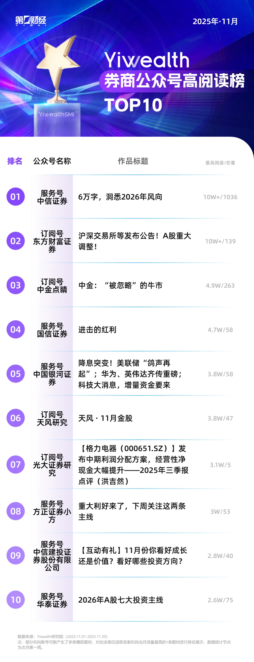 公众号榜单上榜作品以市场重要资讯、投资前瞻为主。例如,中信证券服务号的"6万字,洞悉2026年风向"以10万+阅读量夺得榜首,这篇年度策略报告展现了深度研报的持续影响力和用户对前瞻性内容的强烈需求。