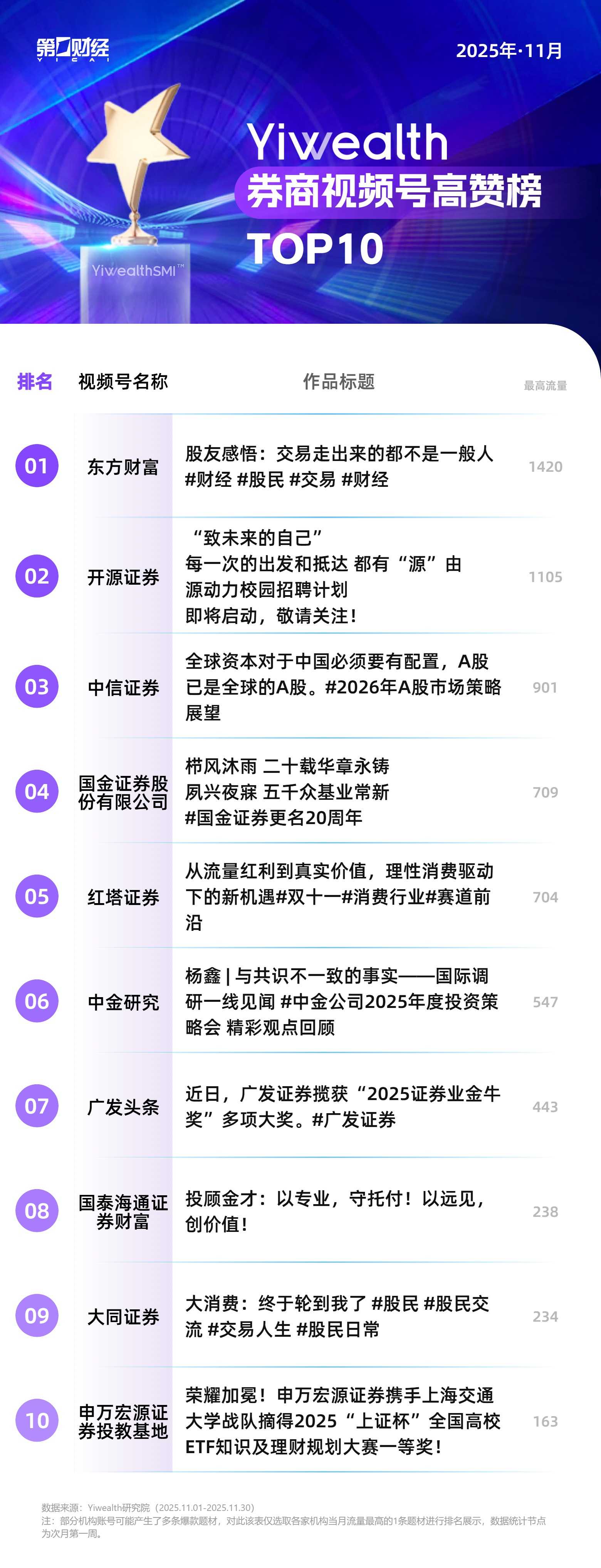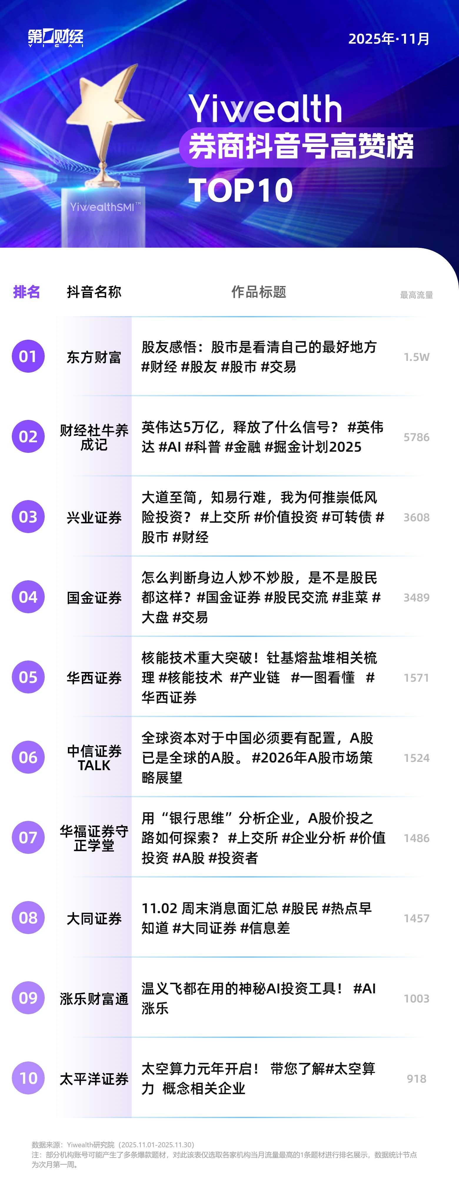 从本期榜单来看,在信息大爆炸的时代,投资者缺的不是投资建议,而是确定感、归属感和被理解的感觉。情感共鸣型投教内容能得到用户认可,本质上是因为它回应了这些更深层的心理需求。因此,做好券商社交媒体内容需要做到专业不失温度,严肃不失趣味,及时不失深度。在监管合规的前提下,大胆创新表达形式,用投资者听得懂、记得住、愿意转的方式,传递有价值的内容。