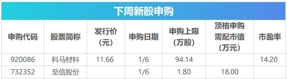 Wind数据显示,下周(1月5日~1月9日)将有2只新股发行,分别为沪市主板的至信股份、北交所的科马材料。