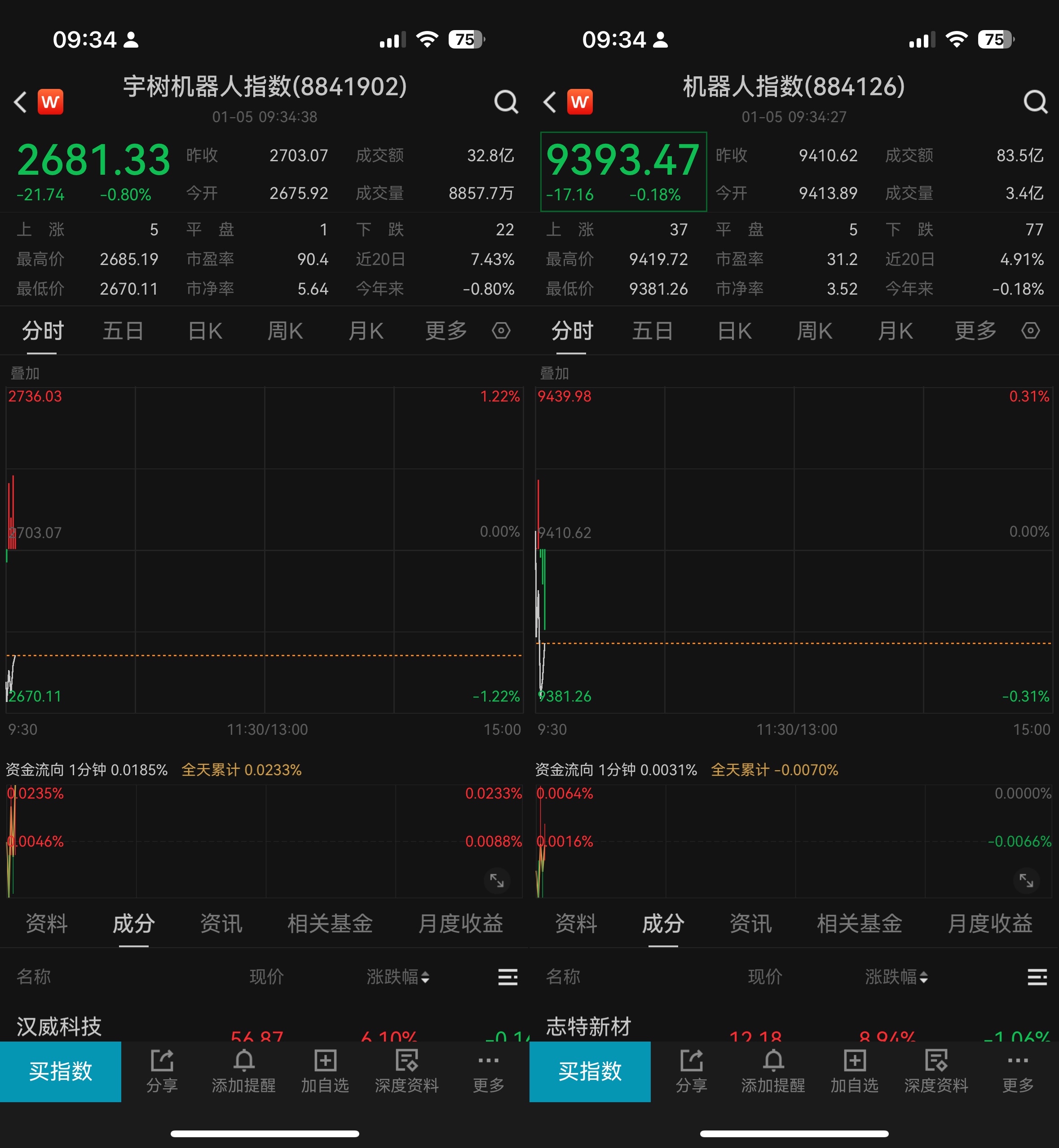 1月5日,宇树机器人指数(8841902)机器人指数(884126)盘初震荡调整。截至发稿,宇树机器人指数跌0.8%,机器人指数跌0.18%。