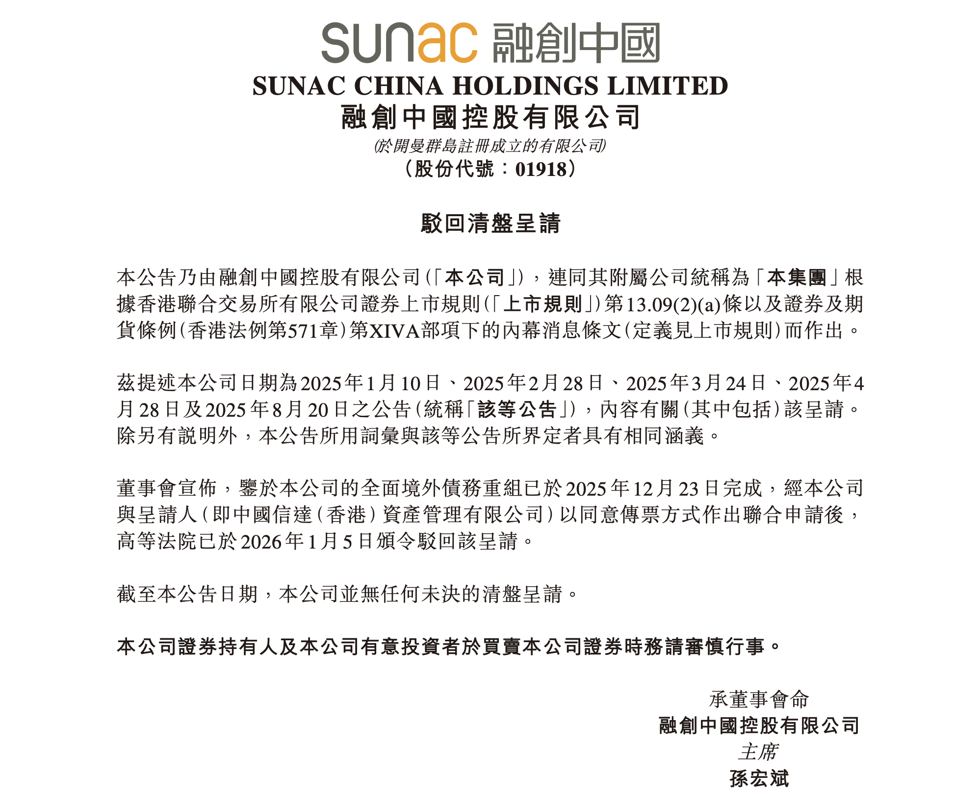 此前2025年1月,融创中国收到中国信达(香港)资产管理有限公司对公司提出的清盘呈请。此后,香港高等法院多次延后聆讯,直至2026年1月5日。