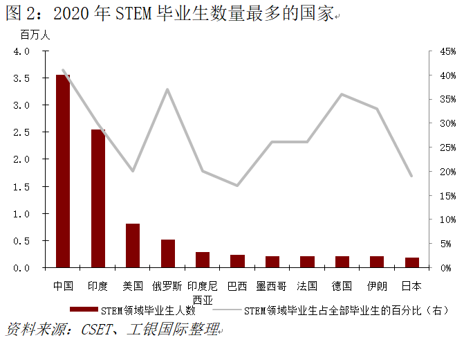其一是工程师规模优势。根据乔治城大学CSET数据,以2020年为例,中国STEM毕业生数量超过第二、第三位国家毕业生数量之和,形成全球最大的工程师供给体系。更重要的是,中国的工程师与产业链高度结合,具备强大的应用导向和工程能力,从而使技术能够更快地转化为产品、更快地融入产业、更快地在规模化场景中验证并迭代。