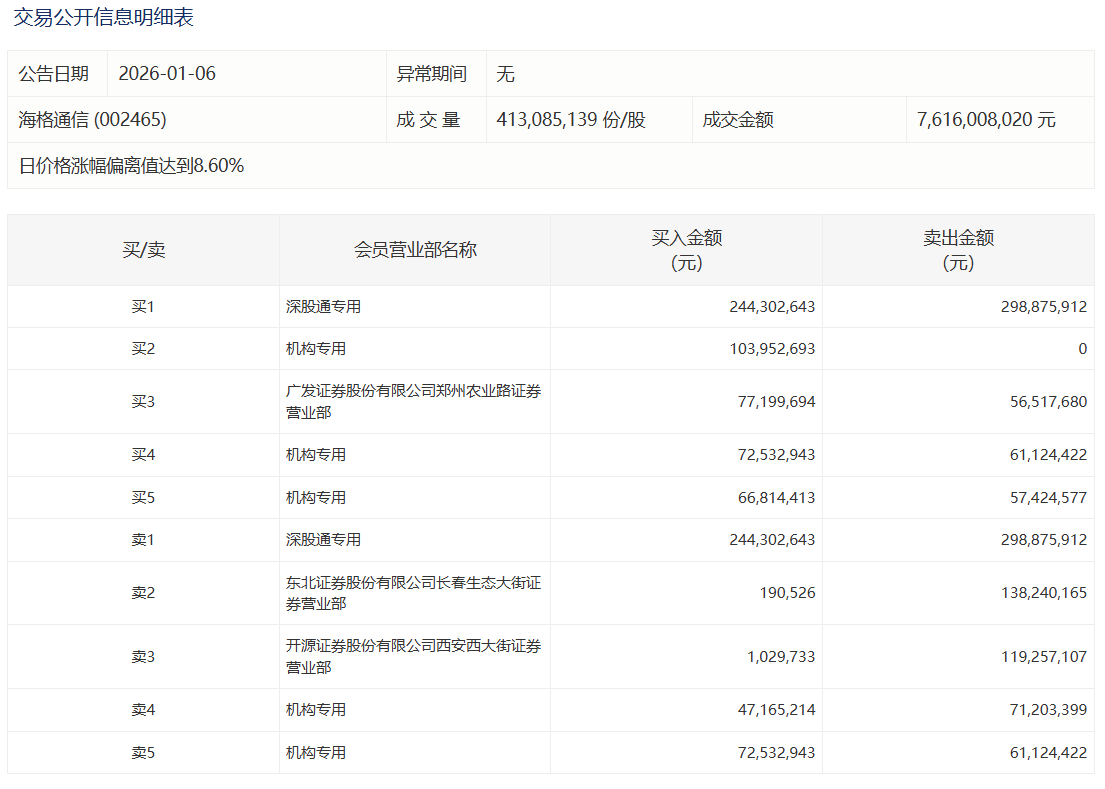 海格通信今日涨停,成交额76.16亿元,换手率16.67%。盘后龙虎榜数据显示,深股通专用席位买入2.44亿元并卖出2.99亿元,3家机构专用席位净买入1.25亿元,有1家机构专用席位净卖出2403.82万元。