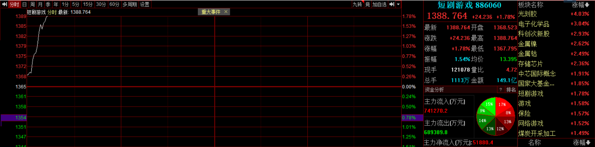 09:41 短剧游戏板块走强,岩山科技、引力传媒、东方明珠、盈新发展涨停,博瑞传媒涨超8%,蓝色光标涨超7%,协创数据、易点天下跟涨。