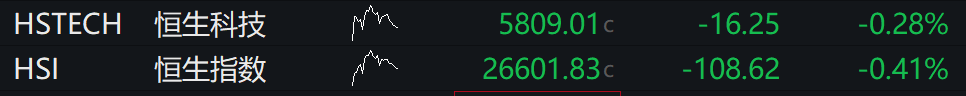 恒生指数低开0.41%,恒生科技指数跌0.28%。阿里巴巴、蔚来跌逾2%,理想汽车、小鹏汽车、百度集团跌幅靠前;华虹半导体、中芯国际走强。