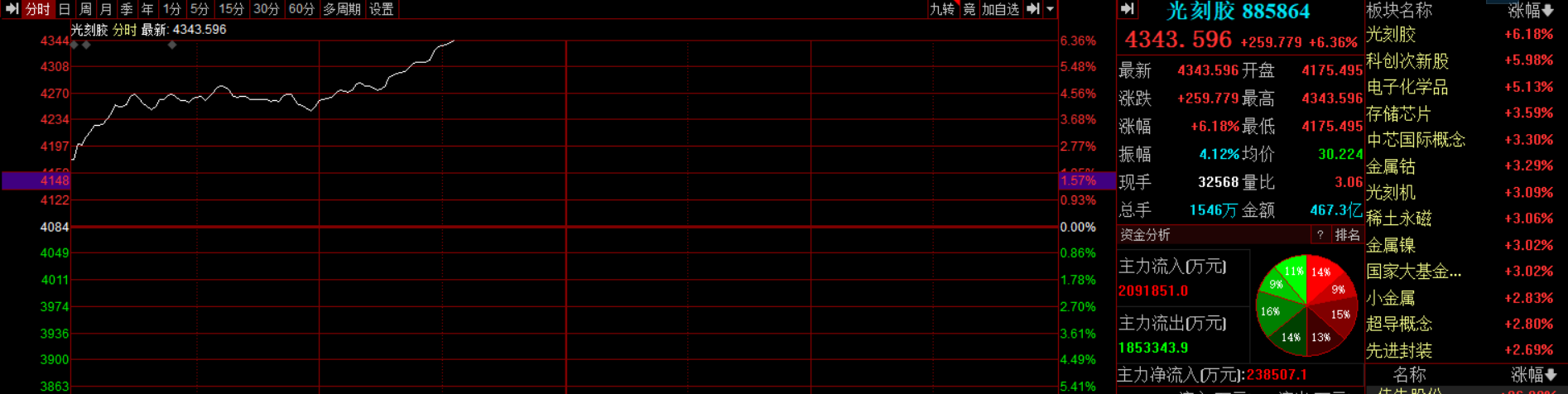 11:02 光刻胶板块持续走高,雅克科技涨停,国风新材、高盟新材、普利特此前封板,安达智能、容大感光涨超10%,新莱应材、广信材料等跟涨。