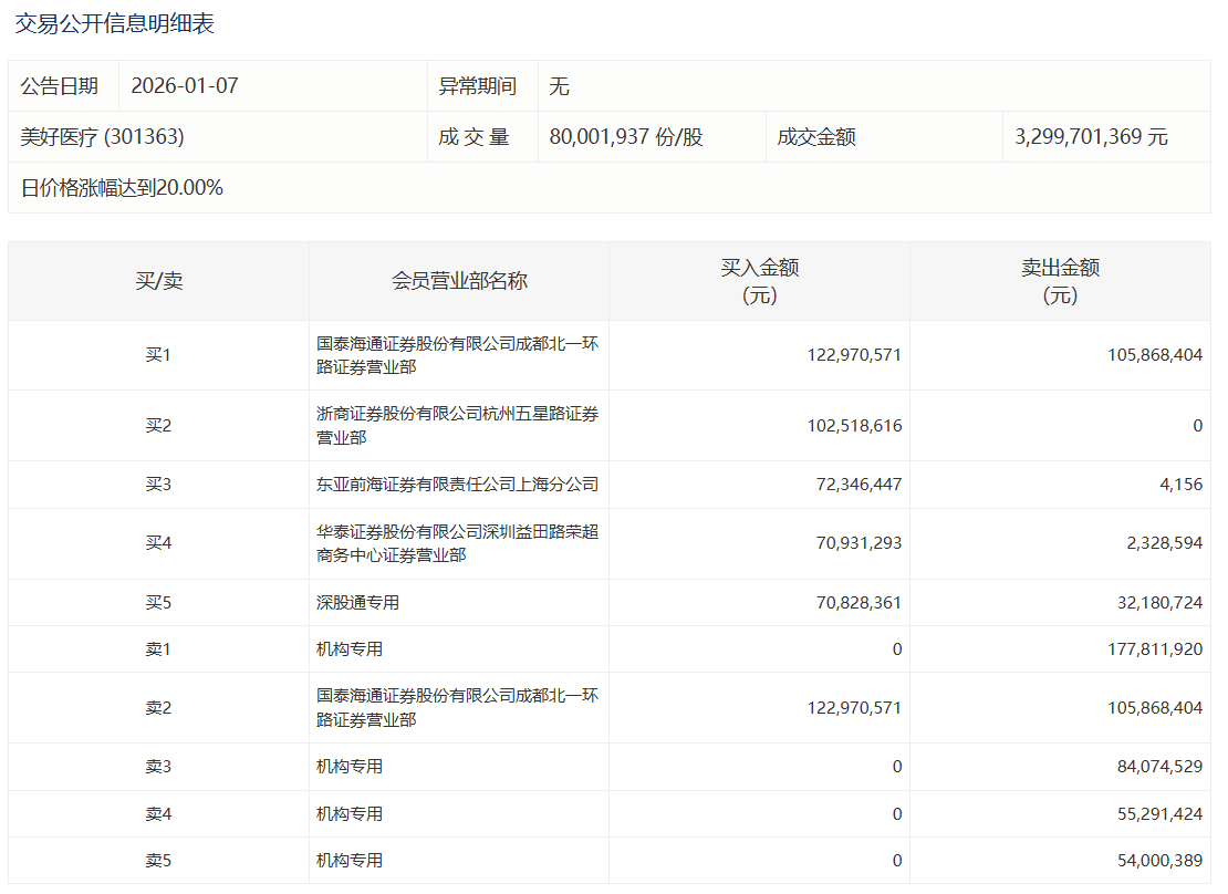 美好医疗今日20%涨停,成交额33.00亿元,换手率21.44%。盘后龙虎榜数据显示,深股通专用席位买入7082.84万元并卖出3218.07万元,有4家机构专用席位净卖出3.71亿元。