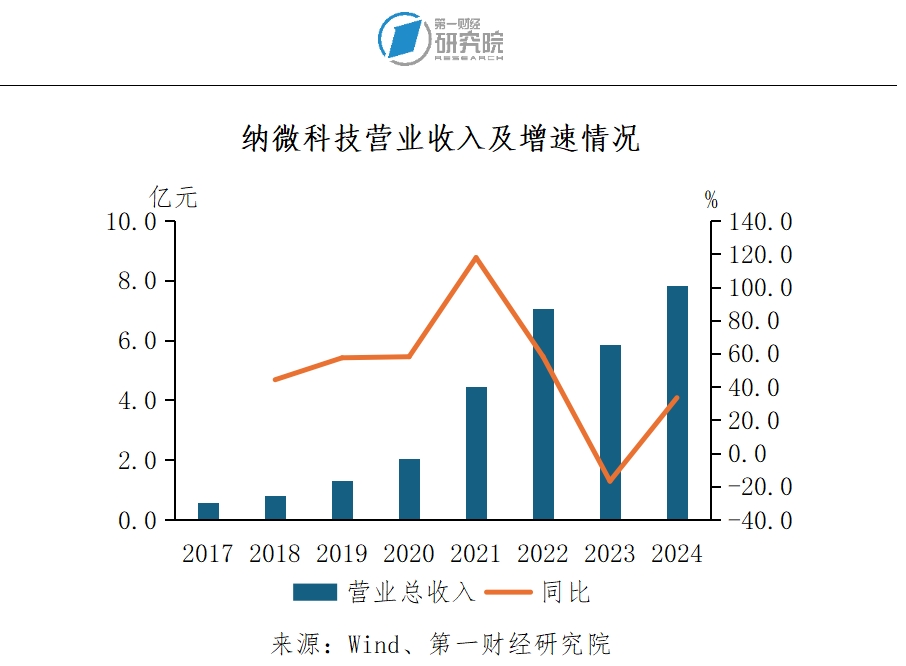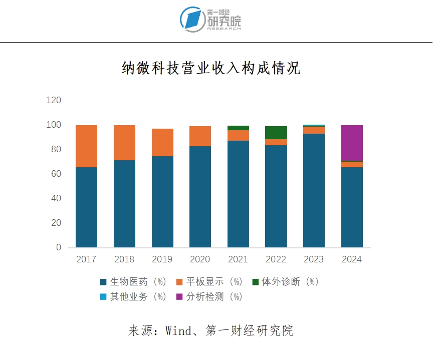 通过持续的技术创新和市场拓展,纳微科技打破了国外企业在生物医药微球领域的长期垄断,实现了国产替代,并逐步提升了在海外市场的竞争力。同时,纳微科技的产品已广泛应用于生物医药、平板显示、分析检测及体外诊断等领域。2017至2024年,纳微科技的营业收入从5714万元增长至7.83亿元,其中,生物医药领域是公司收入的主要来源,占比逐年提升。