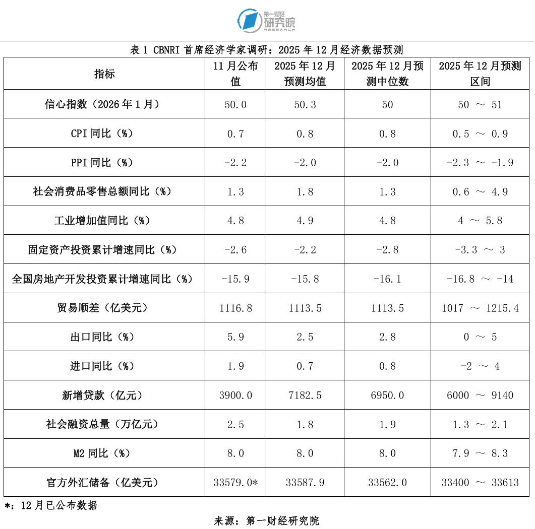 首席经济学家们对2025年12月CPI同比增速的预测均值为0.8%,PPI同比预测均值为-2%。2025年12月工业增加值增速预测均值4.9%,固定资产投资累计增速预测均值为-2.2%,社会消费品零售总额同比增速预测均值为1.8%,贸易顺差预测均值为1113.5亿美元,新增贷款预测均值为7182.5亿元,社会融资总量预测均值为1.8万亿,M2同比增速预测均值为8%。