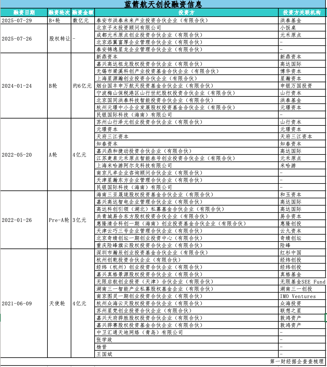 第一类是政府与政策性资本。以蓝箭航天为例,2024年2月,国家产业投资基金向蓝箭航天增资4.5亿元。同年12月,国家制造业转型升级基金入股,增资金额达9亿元。此外,来自北京、上海等科创高地的区域国资平台也积极参与,如上海浦东科技创新投资基金合伙企业(有限合伙)、北京经济技术开发区产业升级股权投资基金(有限合伙)也现身蓝箭航天的股东名单行列。