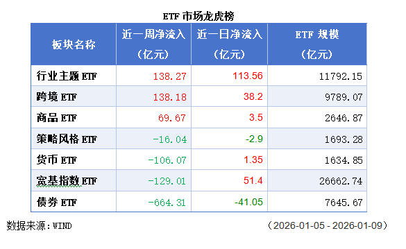 近一周,行业与跨境ETF受到追捧。资金明显偏好行业主题、跨境和商品ETF,反映投资者在寻找结构性机会和跨境配置。