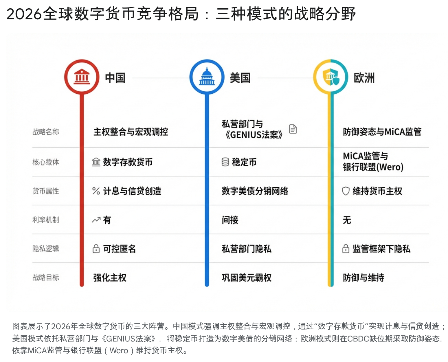 当前形成的“三极分化”格局,实质上是三种货币本体论的碰撞:中国(重构者)通过“数字存款货币”范式,打破了货币发行的零息约束,试图以主权信用穿透商业银行负债端;美国(霸权者)以监管换取市场力量,将私人数字货币异化为美债的数字分销触角;欧洲(防御者)则在公共货币缺位的窗口期,依托监管壁垒与银行联盟构建防御纵深。
