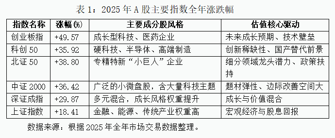 然而,近年来,尤其是进入2025年,一系列市场现象与传统理论产生了尖锐矛盾。一方面,很多业绩稳健、分红率可观、股价跌破每股净资产的银行、地产等蓝筹股持续低迷;另一方面,众多尚未盈利、技术路线尚存变数,但代表前沿科技方向的科创型公司股价却屡创新高。这种分化在2025年A股主要指数涨幅对比中达到极致。如表1所示。