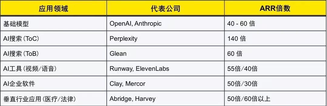 以目前一级市场和私募交易主要采用的ARR倍数为例,近期不同AI细分领域的ARR倍数如下: