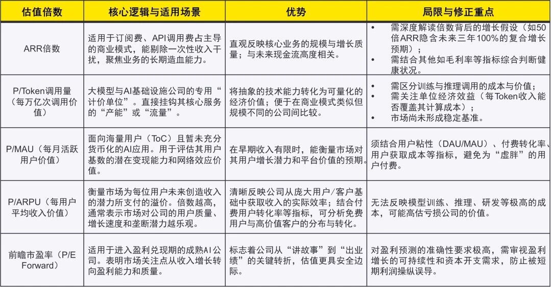 传统的市场法往往需要对上市公司数据进行研究分析,AI行业尚处于快速发展阶段,难以找到真正可比的上市公司,并且每一个AI大模型公司在其技术路径、商业模式和市场定位上都可能存在显著差异,使得直接比较具有不确定性。目前市场正在探索新的行业指标,例如“年度经常性收入(ARR)倍数”“每美元算力对应市值”等,以便更好地反映AI大模型公司的商业化潜力、成本与效率以及“护城河”深度。
