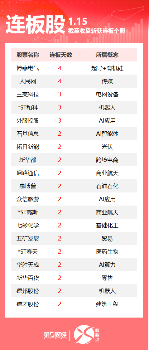 1月15日,Wind数据显示,A股市场共计65只个股涨停。其中GEO概念人民网4连板,商业航天板块盛路通信2连板。一图速览今日连板股>>