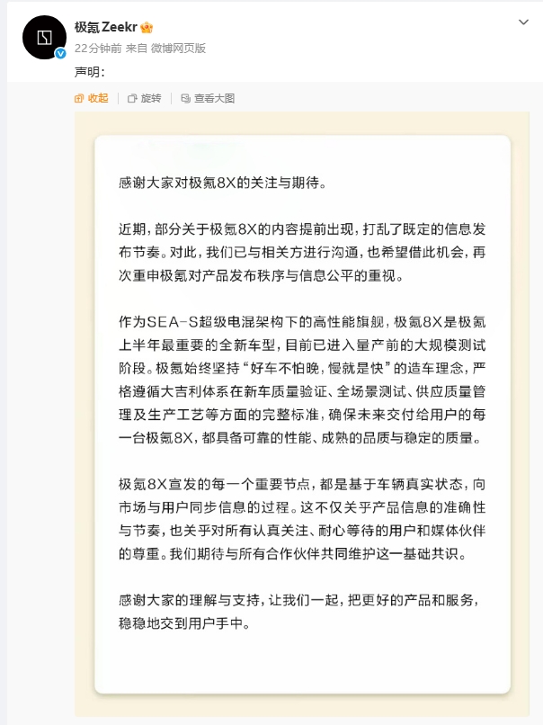 极氪:部分极氪8X内容提前出现,打乱既定信息发布节奏