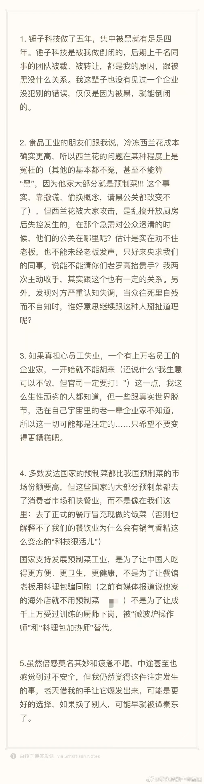 1月16日,罗永浩公开表示,锤子科技倒闭是他的原因,没见过一家企业仅仅因为被黑就能倒闭;如果担心员工失业,作为企业家,一开始就不应胡来;多数发达国家预制菜比我国市场份额高,但主要流向消费者市场与快餐业,而非正式餐厅。(第一财经记者 吕倩)