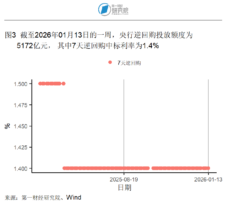截至1月13日的一周,央行通过公开市场净回笼资金778亿元。本周,央行逆回购投放额度为5172亿元,逆回购到期5950亿元,7天逆回购中标利率为1.4%。