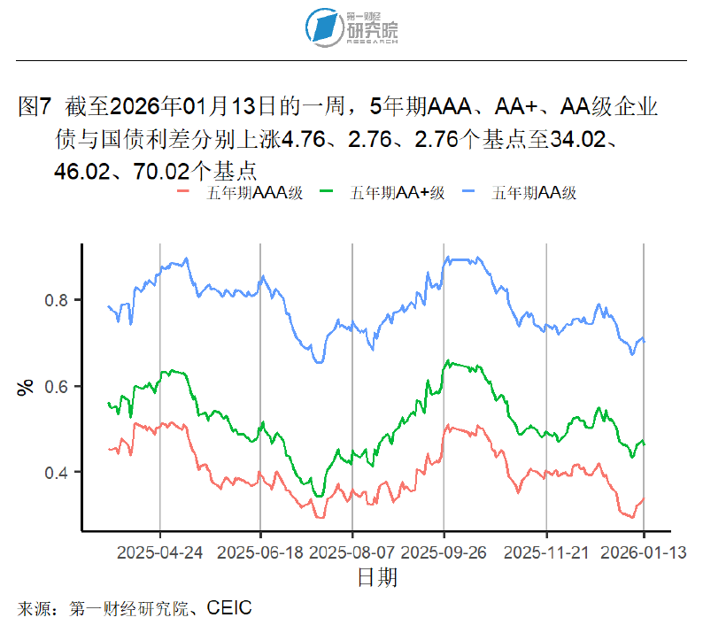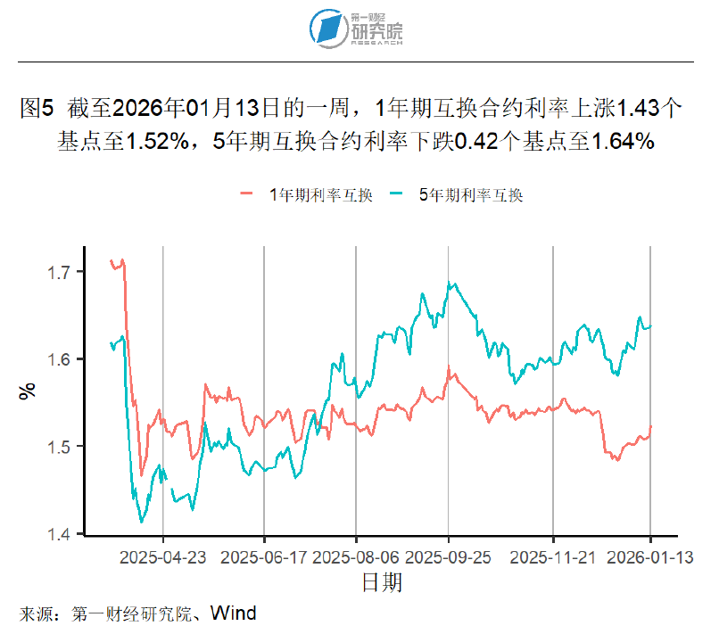 截至1月13日的1年期互换合约利率在过去一周上升1.43个基点至1.52%,在过去一个月下降1.14个基点,较去年同期下降6.22个基点。5年期互换合约利率在过去一周下降0.42个基点至1.64%,在过去一个月上升1.93个基点,较去年同期上升13.2个基点。