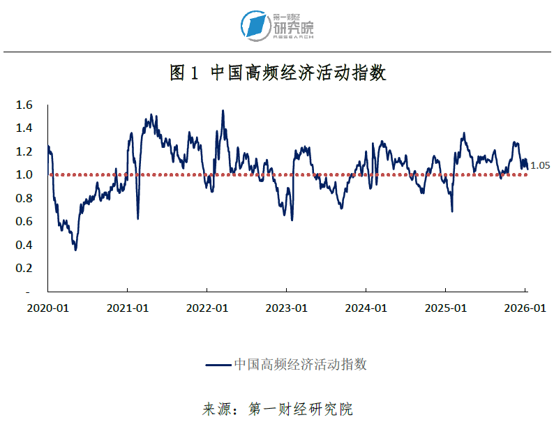 2026年1月13日第一财经研究院中国高频经济活动指数(YHEI)为1.05,较2026年1月6日下降0.09。具体来看,截至1月13日的一周内,工业相关指标“沿海煤炭运价指数”下降0.09,是YHEI下降的重要原因;“进口干散货运价指数”与前一周基本持平。