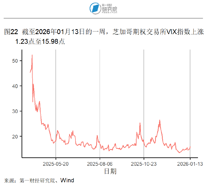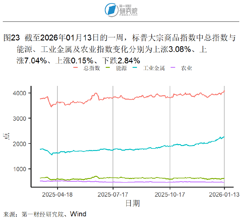 截至1月13日的一周,芝加哥期权交易所VIX指数上升1.23点至15.98点。标普大宗商品总指数在本周上升3.08%至4090.93。能源指数上升7.04%至638.38;工业金属和农业指数分别上升0.15%和下降2.84%至2256.27和464.57。