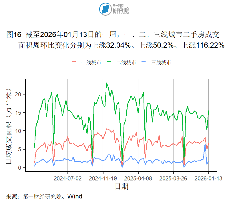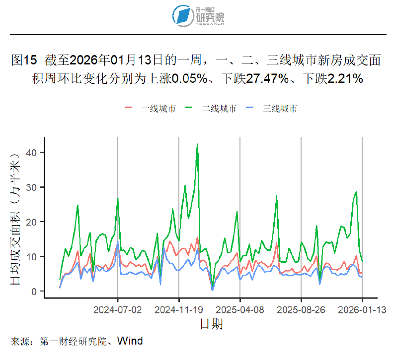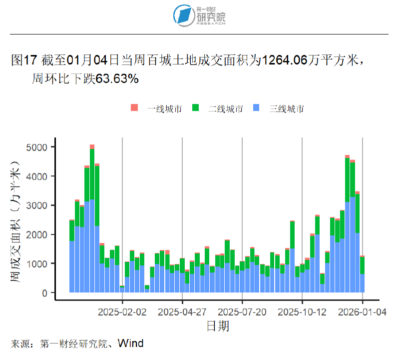 截至1月13日的一周中,一线城市新房及二手房成交面积分别环比上升0.05%和32.04%;二线城市两类房屋成交面积分别环比下降27.47%和环比上升50.2%;三线城市两类房屋成交面积则分别环比下降2.21%和环比上升116.22%。本周,所有房屋日均成交面积均低于去年同期水平。截至1月4日的一周,百城土地成交面积为1264.06万平方米,周环比下降63.63%。