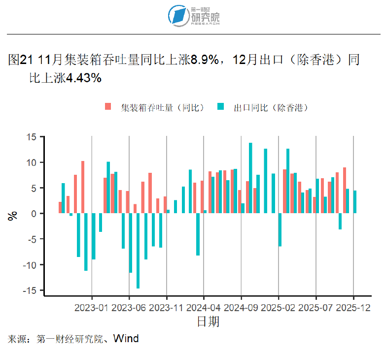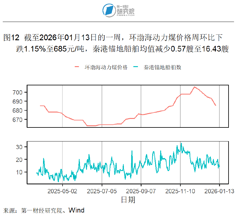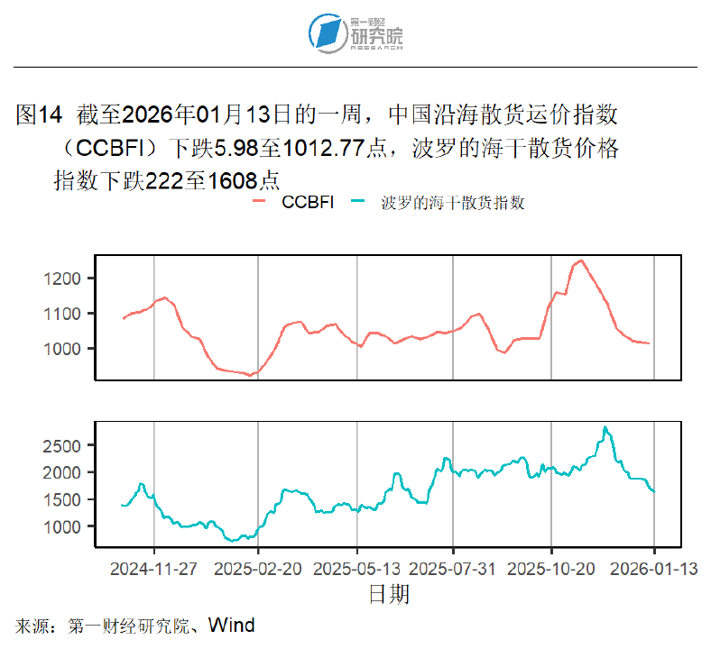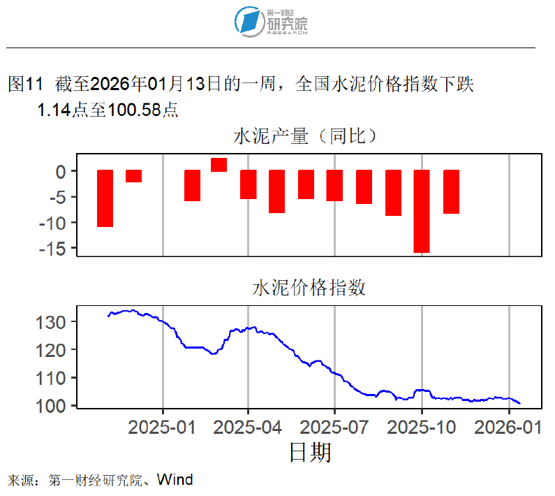截至1月13日的钢坯价格在过去一周上升1.37%,较一个月前上升1.02%,与去年同期持平。水泥价格在截至1月13日的一周下降1.12%,过去一个月下降1.95%,较去年同期下降21%。动力煤价格在过去一个月下降2.56%,较去年同期下降2.28%。