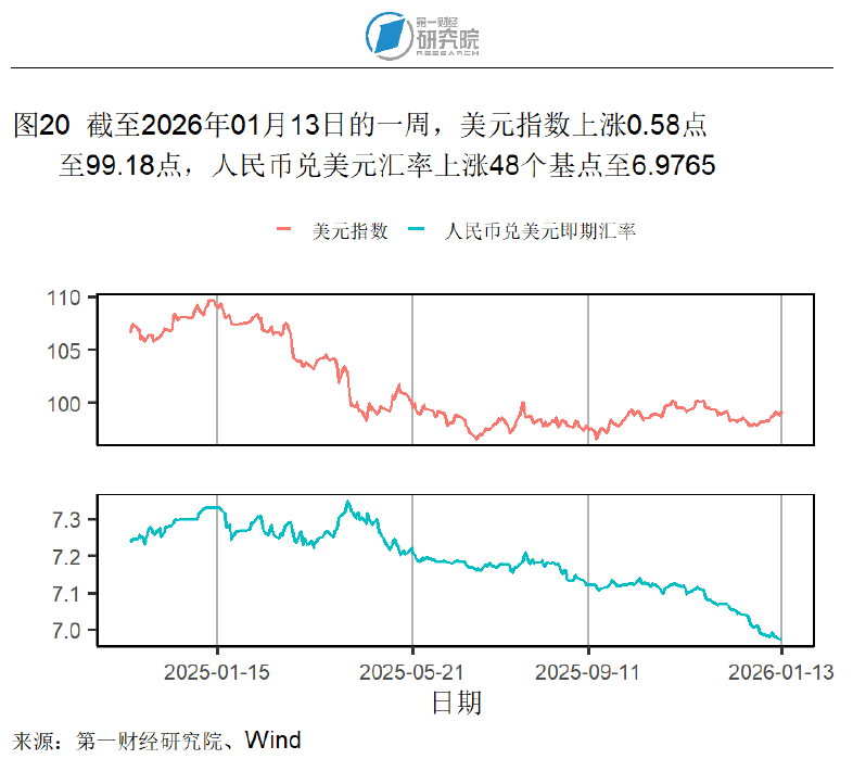 高频数据显示,截至1月13日的一周,美元指数上升0.58点至99.18点;人民币兑美元汇率下降48个基点至6.9765。