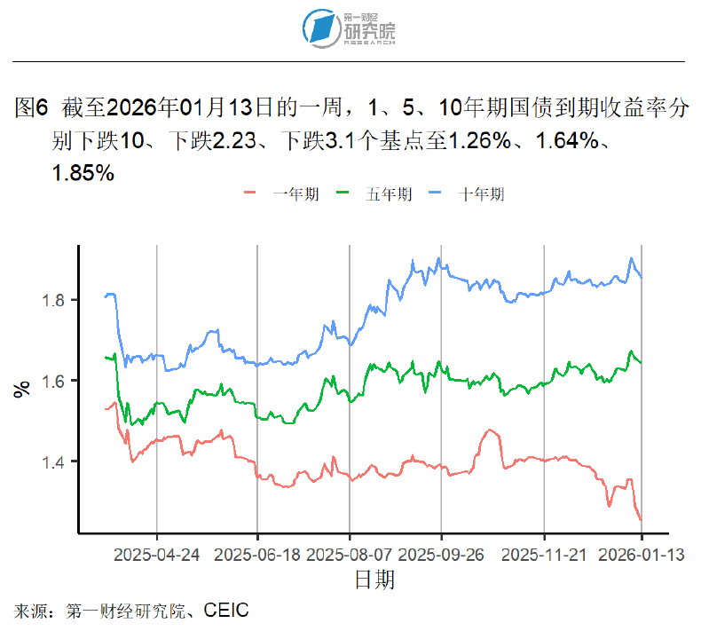 截至1月13日的一周,1年期、5年期和10年期国债到期收益率分别下降10、2.23和3.1个基点至1.26%、1.64%和1.85%。