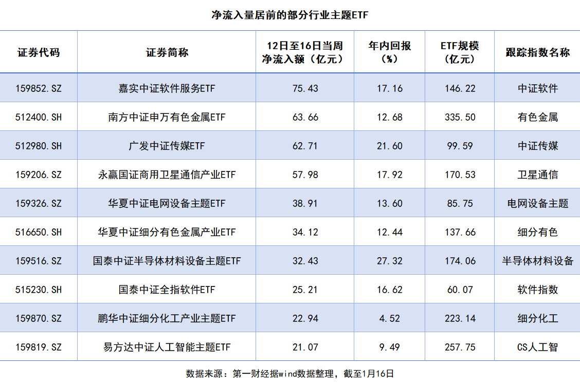 从细分行业来看,软件、传媒、半导体等方向最受青睐,相关方向均获得50亿元以上的资金净流入,部分产品规模突破历史峰值。例如嘉实中证软件服务ETF单只产品净流入就达75.43亿元,规模突破146亿元,创下历史新高。