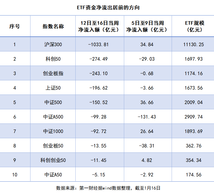 Wind数据显示,1月12日至16日当周,超2000亿元资金从核心宽基ETF撤离,较前一周暴增15倍,创下单周净流出历史新高;沪深300、科创50等核心品种成资金撤离主战场,其中沪深300ETF就有超过千亿元资金净流出。