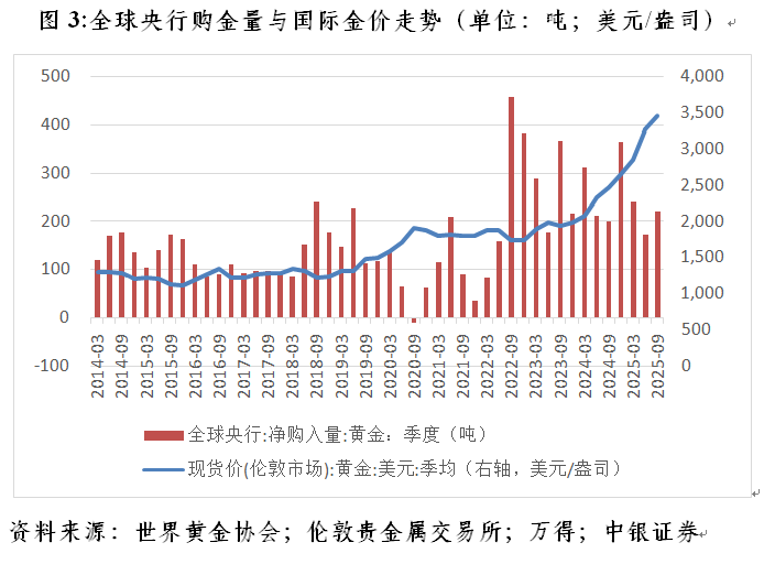 再者,黄金在全球国际储备中份额上升,主要原因不是央行购金,而是国际金价上涨带来的正估值效应。根据世界黄金协会的统计数据,2022年一季度至2025年三季度,全球黄金储备余额增加2.44万亿美元,其中,央行累计净购入黄金3854吨,约合3019亿美元(季度央行净购金量×季均伦敦现货国际金价×1吨折合35273.96盎司),仅贡献了同期黄金储备余额增幅的12.3%(见图3)。