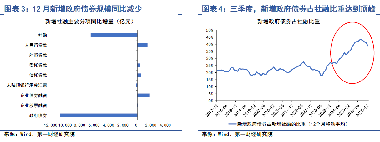 政府债券方面,12月新增政府债券融资6833亿元,较2024年同期减少1.08万亿元。2025年四季度以来,新增政府债券规模有所下滑,这主要是年内特别国债和地方政府专项债整体发行前置所导致的。从全年来看,新增政府债券是支撑2025年新增社融的重要力量,2025年三季度新增政府债券占社融的比重平均高达43%,为年内顶点,四季度该占比回落至40.5%。