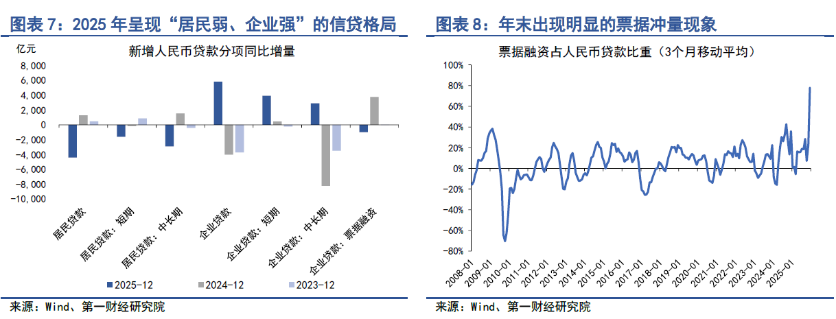 2025年末,银行票据冲量的现象明显。四季度,金融机构票据融资规模达到1.2万亿元,占同期新增人民币贷款的比重高达77%左右。