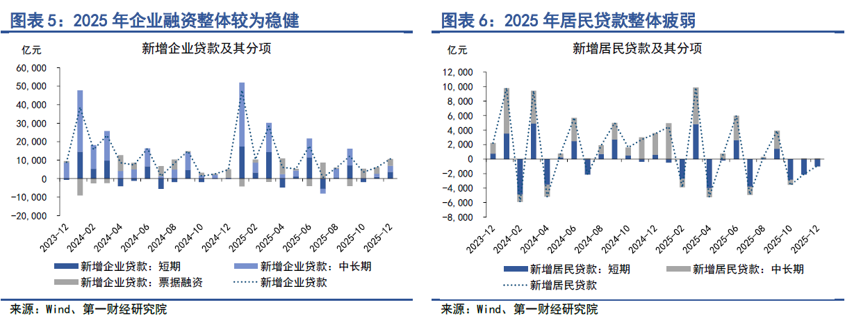 从主要分项来看,12月新增人民币贷款9804亿元,较2024年同期多增1402亿元。2025年全年,新增人民币贷款的表现偏弱,除一季度开门红之外,其余时间新增人民币贷款均弱于往年同期。