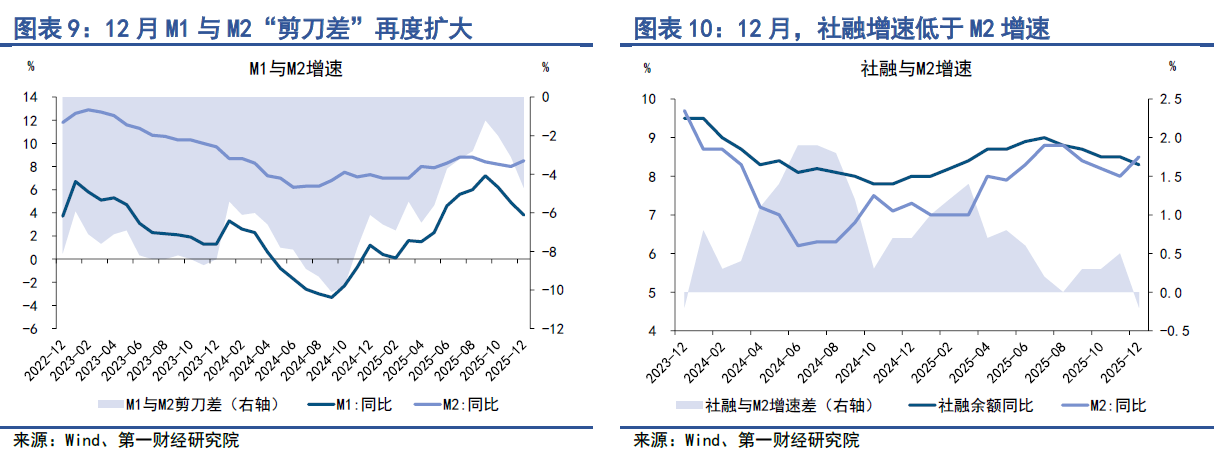 2025年12月,M1同比增速为3.8%,较11月下降1.1个百分点;M2同比增速为8.5%,较11月上升0.5个百分点。四季度,M1与M2之间的“剪刀差”再度扩大,这或与四季度政府债券发行落地放缓有关。值得注意的是,12月社融同比增速落后于M2增速,为2023年12月以来首次。
