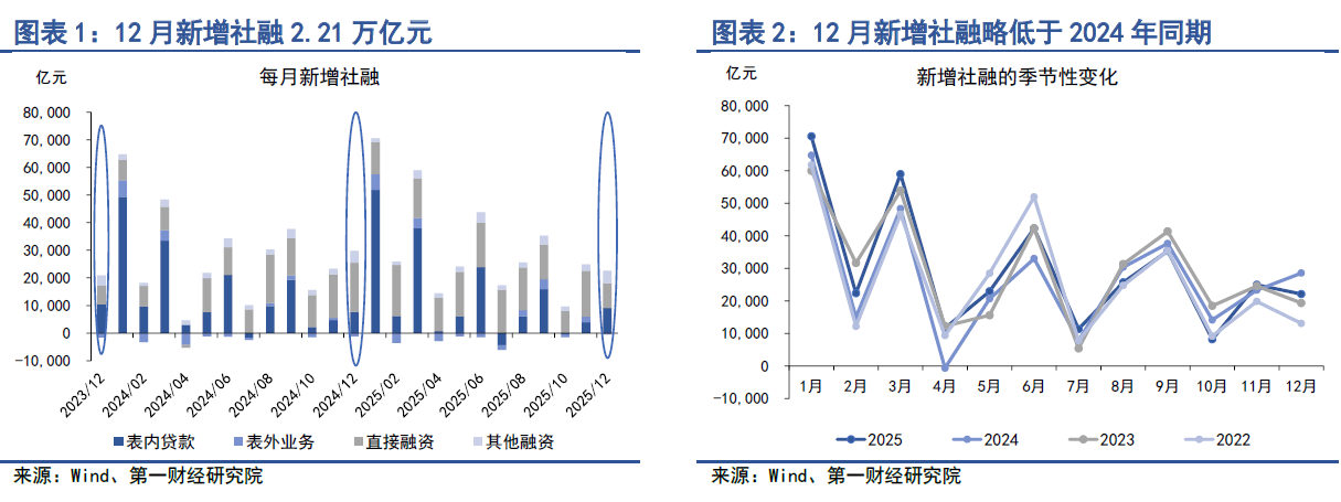2025年12月,新增社融2.21万亿元,较2024年同期减少6462亿元,高于2022年和2023年同期。从存量来看,12月社融存量同比增速为8.3%,增速较11月下降0.2个百分比。