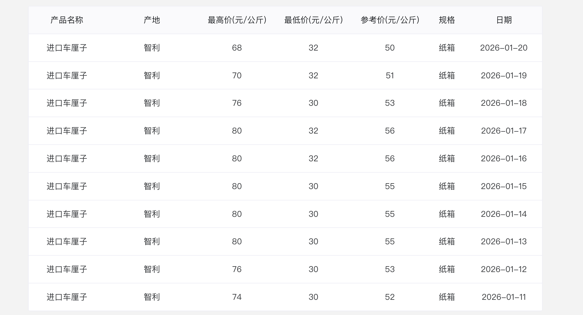 近期车厘子价格因品种、规格及供需关系差异显著波动,高端品种价格坚挺,整体因智利产量下调、春节临近前供大于求导致价格回落,但节前有望回升。